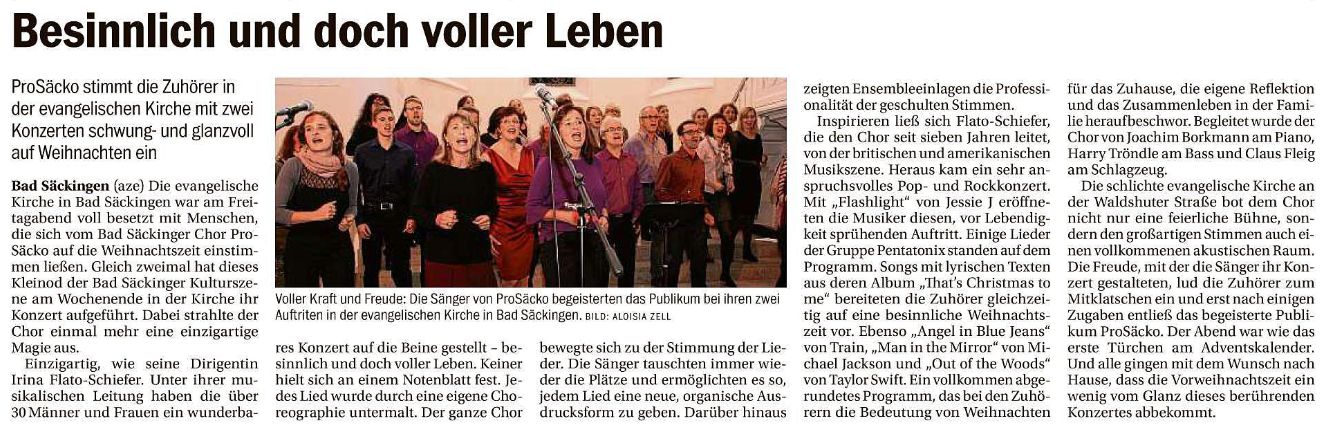 ProSäcko stimmt die Zuhörer in der evangelischen Kirche mit zwei Konzerten schwung- und glanzvoll auf Weihnachten ein. - Badische Zeitung, 04.12.2017 -