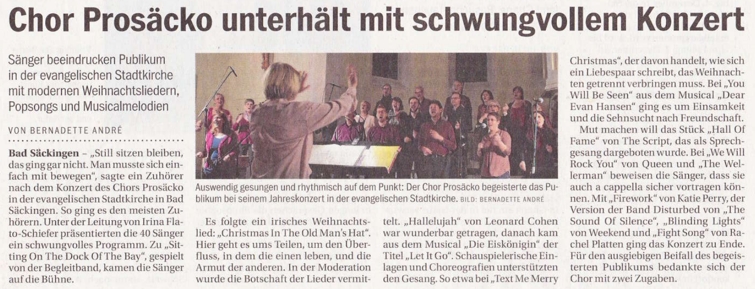 Bad Säckinger Chor ProSäcko verzaubert die Besucher mit einem anspruchsvollen Pop- und Rockkonzert. - Südkurier, 03.12.2018 -